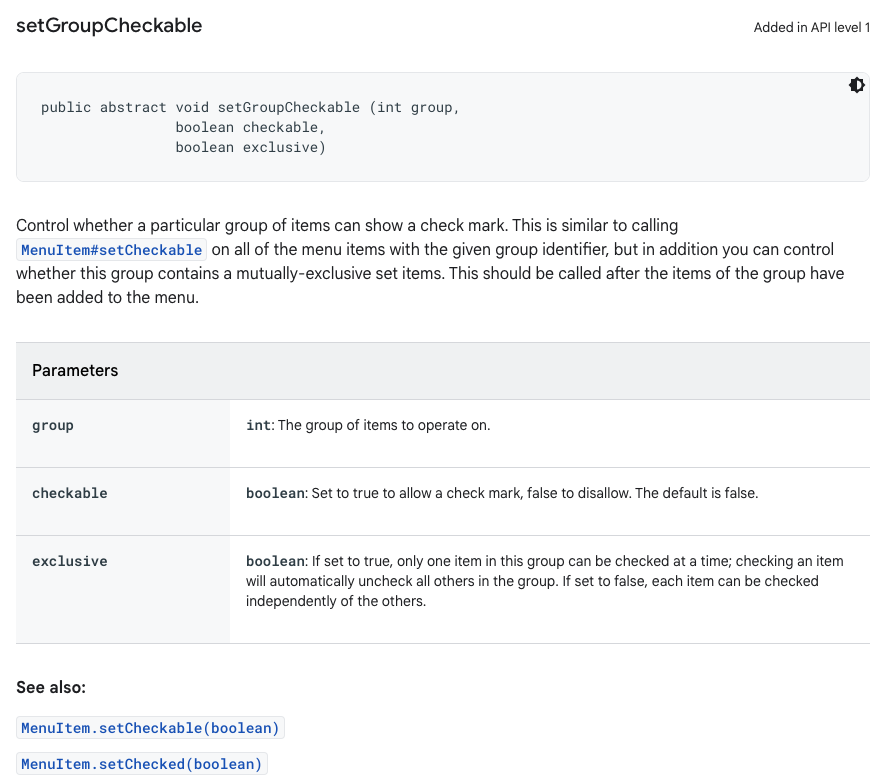 세번째 파라미터가 true일 때, 해당 그룹에서는 아이템을 선택하게 되면 다른 아이템은 자동으로 선택 해제된다.
